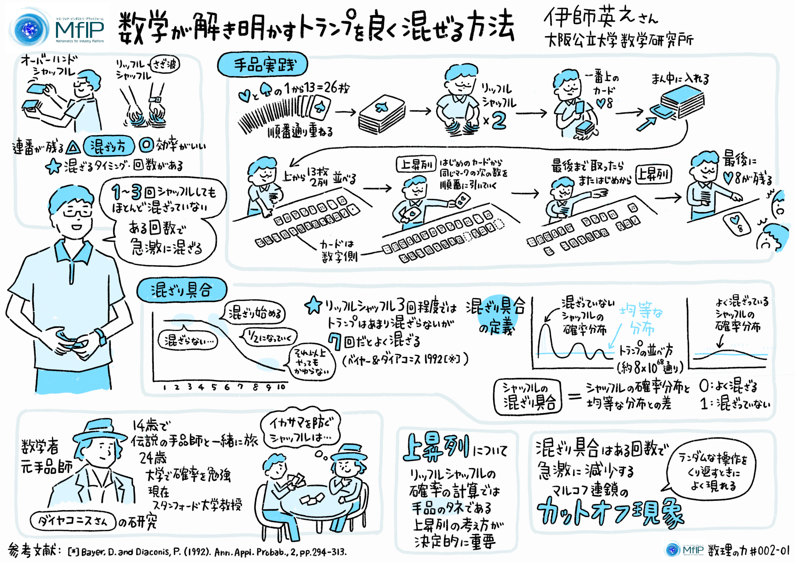 トランプなどのカードゲームで遊ぶ時に, よく混ざるようにカードをシャッフルしますね. シャッフルした後で, カードがどれくらい混ざっているか気になりませんか? 数学を使って,カードの混ざり具合を調べてみましょう!
